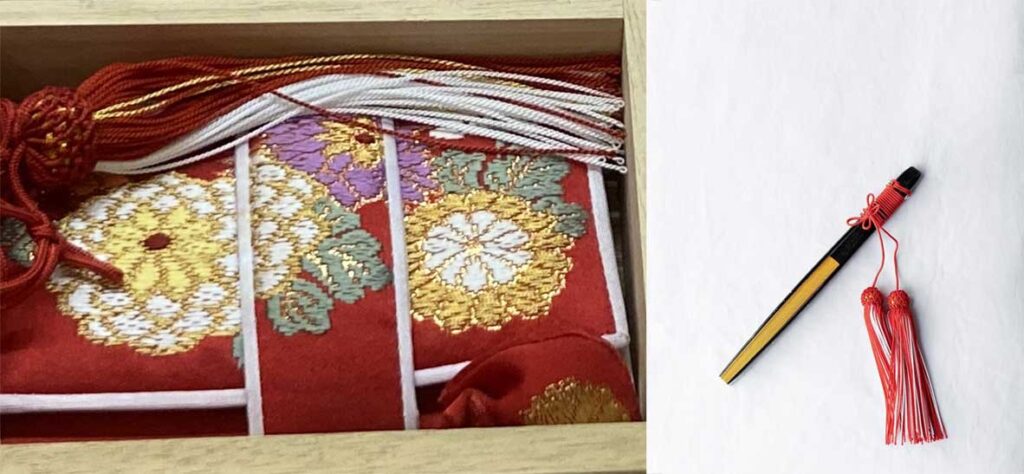 また、帯締めに挿しこむ扇子も必ず必要な装身具です。柄には鶴や松などの吉祥柄があしらわれています。扇子は、先に向かって広がる形から「末広」とよばれ節目節目の祝い事によく用いられます。七歳の祝いや結婚の儀では、人生が末広がりに栄えるようにという願いが込められています。この時の帯締めは、中に綿が詰まった「丸くげ」という種類の帯締めを使い、七歳の祝いと花嫁衣装にも使用する形状には、永遠に続く幸せという意味が込められているそうです。