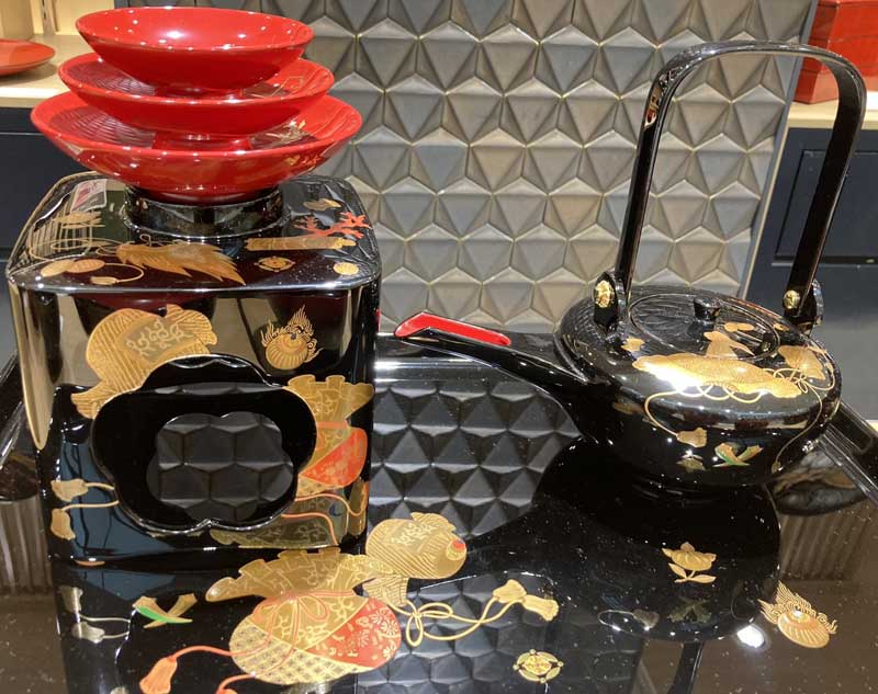 屠蘇をいただく為の道具である屠蘇器。現代では、身近な道具とはいえなくなってしまいましたが、12月になると屠蘇器が漆器売り場に並びます。この写真は、輪島塗の屠蘇器です。正月に相応しいおめでたい絵柄が描かれています。日本には、その事柄に多くの願いを託す表現が形や絵柄にあらわされています。息をのむ美しい手仕事です。