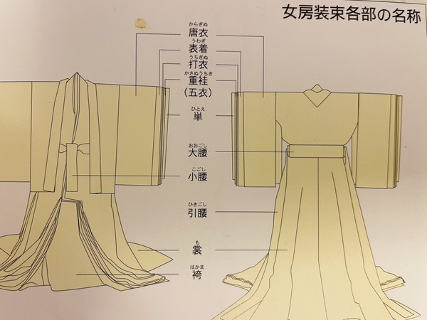 この資料は、十二世紀後期に源雅亮が記した「満佐須計装束抄」の中に女房の装束のいろとして記されていたものの再現。と書かれてあります。