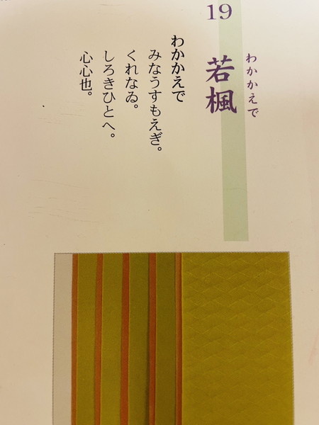 今回は、夏の一部を抜粋しましたが春は萌木の匂い、柳 卯の花 秋は、黄菊 もぢり紅葉、すすき 冬は、雪の下 梅重ね などなど赴きのある表現と襲色目。