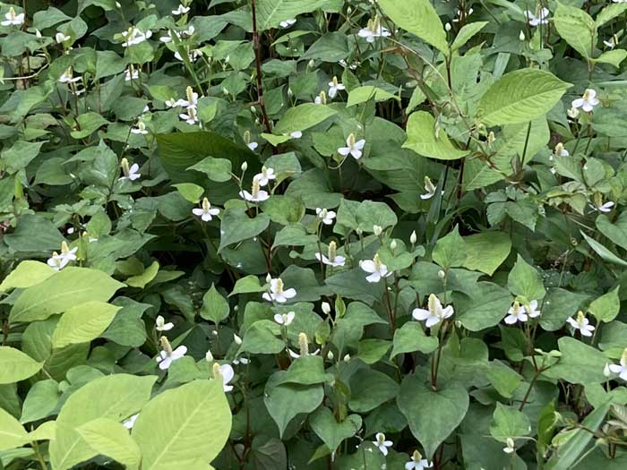 雑草に混じって群生して可愛いらしい白い花が咲いている様子。しかしながら、この名前ドクダミ?