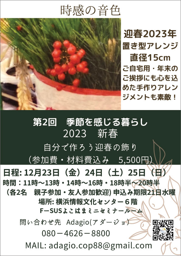 2023年新しい年に向け和紙や水引を使い伝統的な厳守さと、正月のストーリーに相応しい松や南天をアレンジしていきます。食卓の演出やインテリアにも迎春の華やぎを添えるアレンジです。ご自宅用にもプレゼントにも最適です。